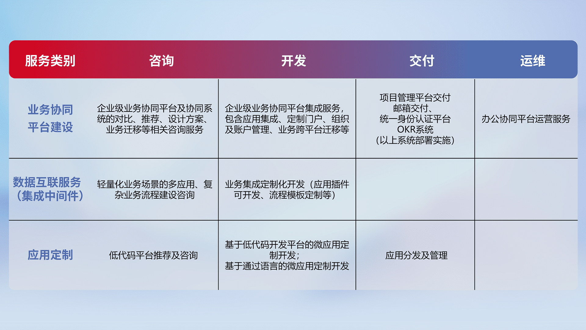 针对钉钉、、、、企微、、IDaas等平台级产品提供产品的规划、、、方案、、、交付、、定制化开发等服务,,,,实现如统一协同办公、、、智能客户服务、、、、混合会议管理、、智能数据查询、、、等业务场景,,实现数字化转型。。。