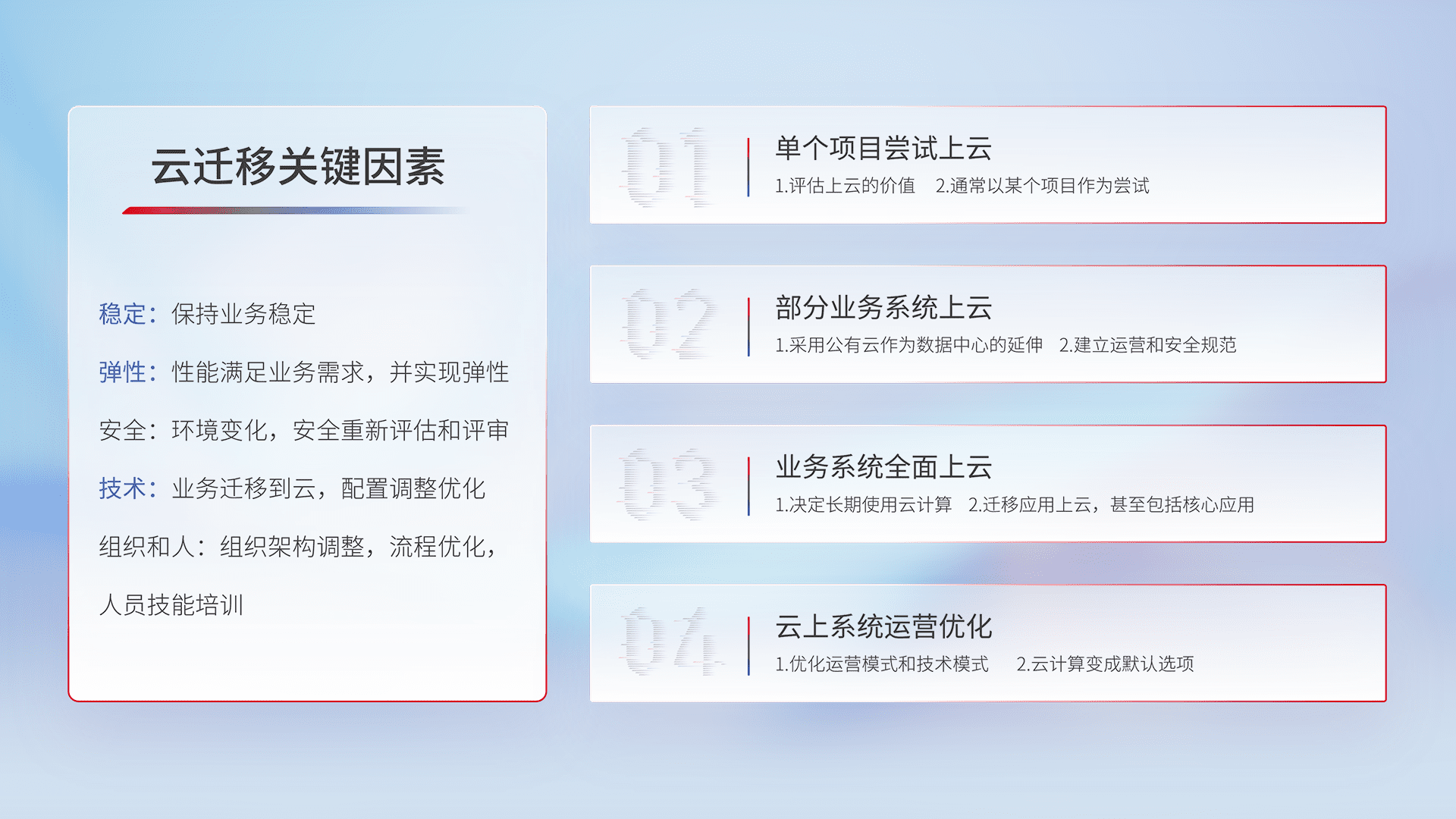 结合实际业务,,从规划设计、、、、云平台选型、、云原生改造、、、数据迁移、、、、集成交付,,,迁移全过程为客户识别最佳上云路径,,做好风险识别管理,,,设计网络架构、、、身份权限、、安全审计合规、、、操作审计、、日志审计、、监控告警策略、、、、多站点容灾设计等,,对云上基础设施进行整体规划,,提升IT治理水平,,,,以满足弹性、、、高可用、、、、高性能的需求。。。