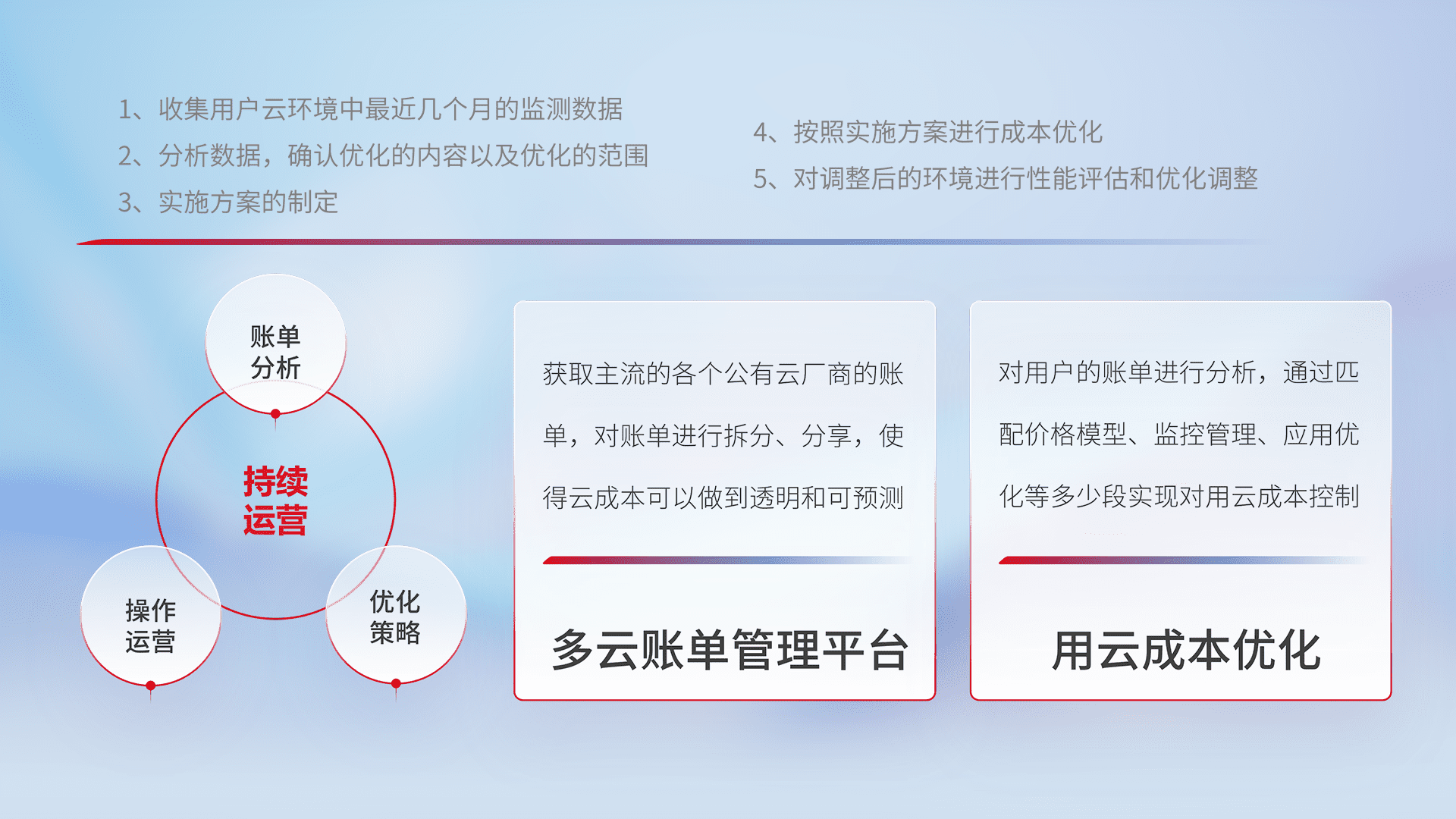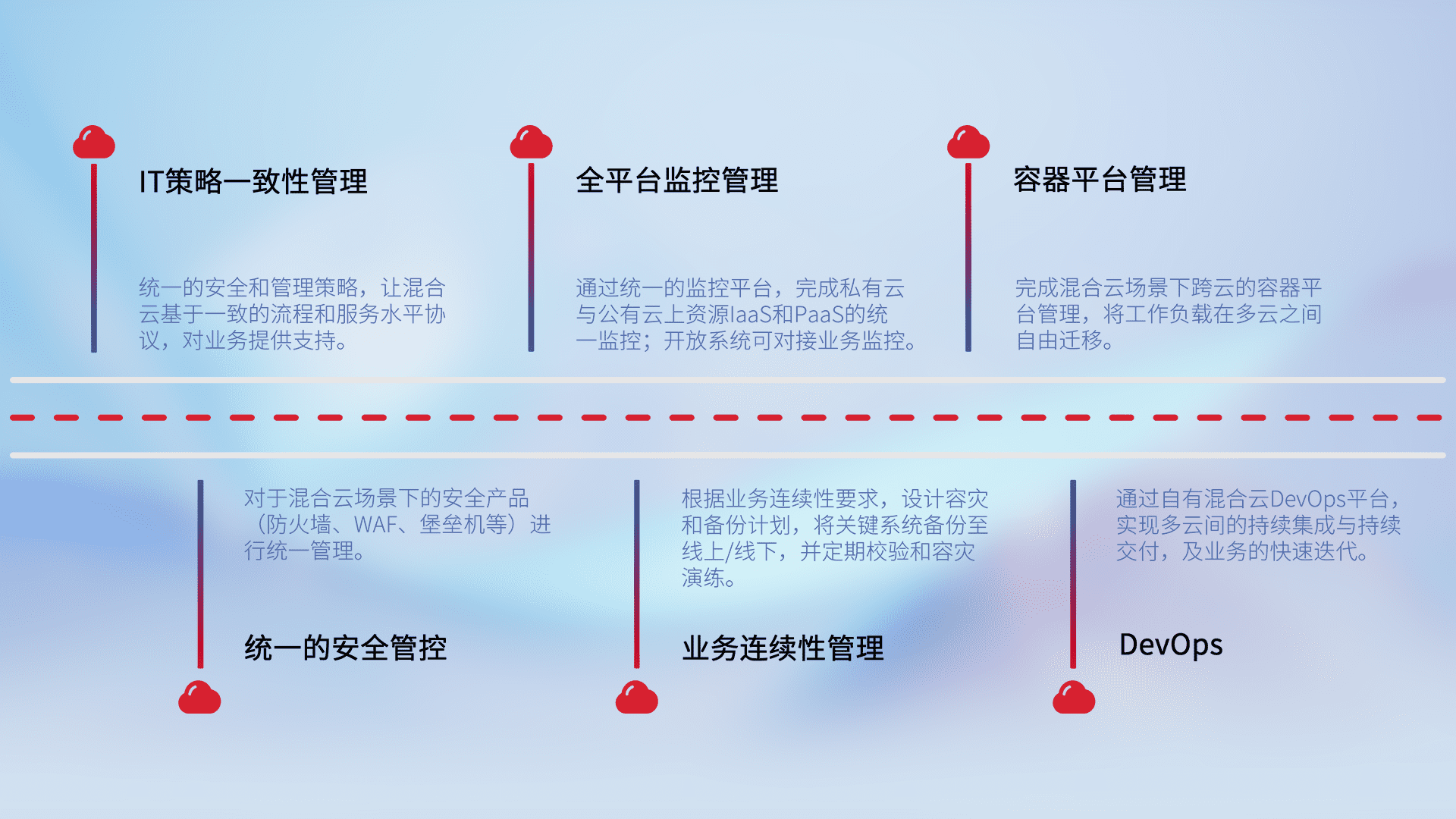 通过多云纳管,,以统一的资源数据模型把客户的云资源进行抽象和封装,,,,进而实现对多云资源的统一操作,,,保障云资源管理的可靠性、、稳定性与可用性。。。。量身定制化运维内容,,,,配置、、开发运维、、、补丁管理、、、备份、、、监控、、、、认证和访问管理、、、、审计和日常巡检等,,,保障在用云过程中的可靠度,,,,稳定度以及高可用率。。。。